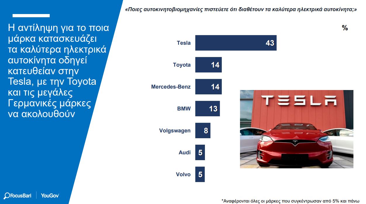Συγκεκριμένα, όπως προκύπτει από έρευνα της Focus Bari, μεγαλύτερη αναγνωρισιμότητα στην Ελλάδα για την σχετική αγορά έχει η Tesla, η οποία κατά τους Έλληνες θεωρείται ότι παράγει τα καλύτερα ηλεκτρικά οχήματα. Με πολύ μεγάλη διαφορά ακολουθεί η Toyota, η Mercedes- Benz και η BMW.
