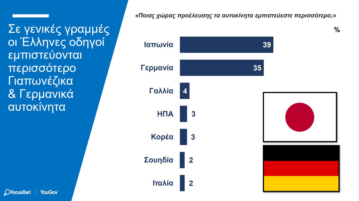 Επίσης, οι Έλληνες φαίνεται να εμπιστεύονται περισσότερο τα ιαπωνικά (39%) και τα γερμανικά (35%). Με μεγάλη διαφορά ακολουθούν τα αυτοκίνητα προέλευσης από Γαλλία (4%) και από ΗΠΑ, Κορέα (3%).