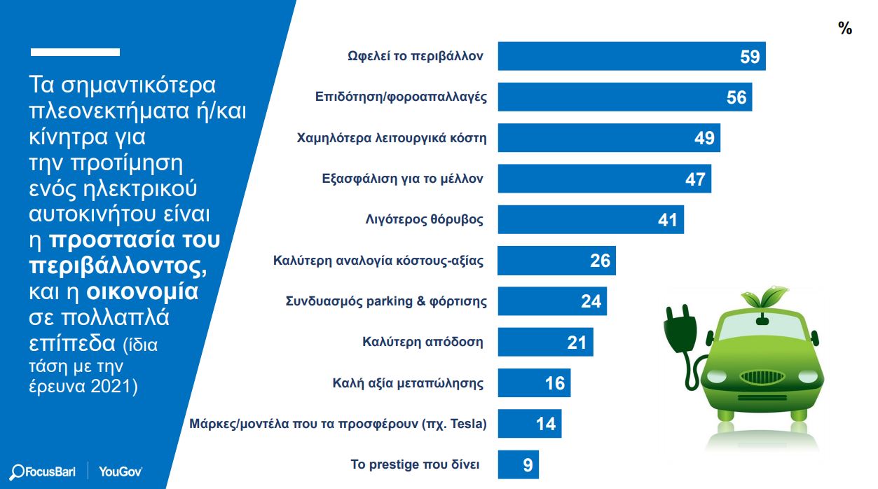Επίσης, το 94% των ερωτηθέντων, έναντι 85% το 2021, αναγνωρίζει τουλάχιστον ένα πλεονέκτημα στα ηλεκτρικά αυτοκίνητα. Παράλληλα όμως, το 99% έναντι 90% πέρυσι, εντοπίζει και τουλάχιστον ένα αρνητικό.