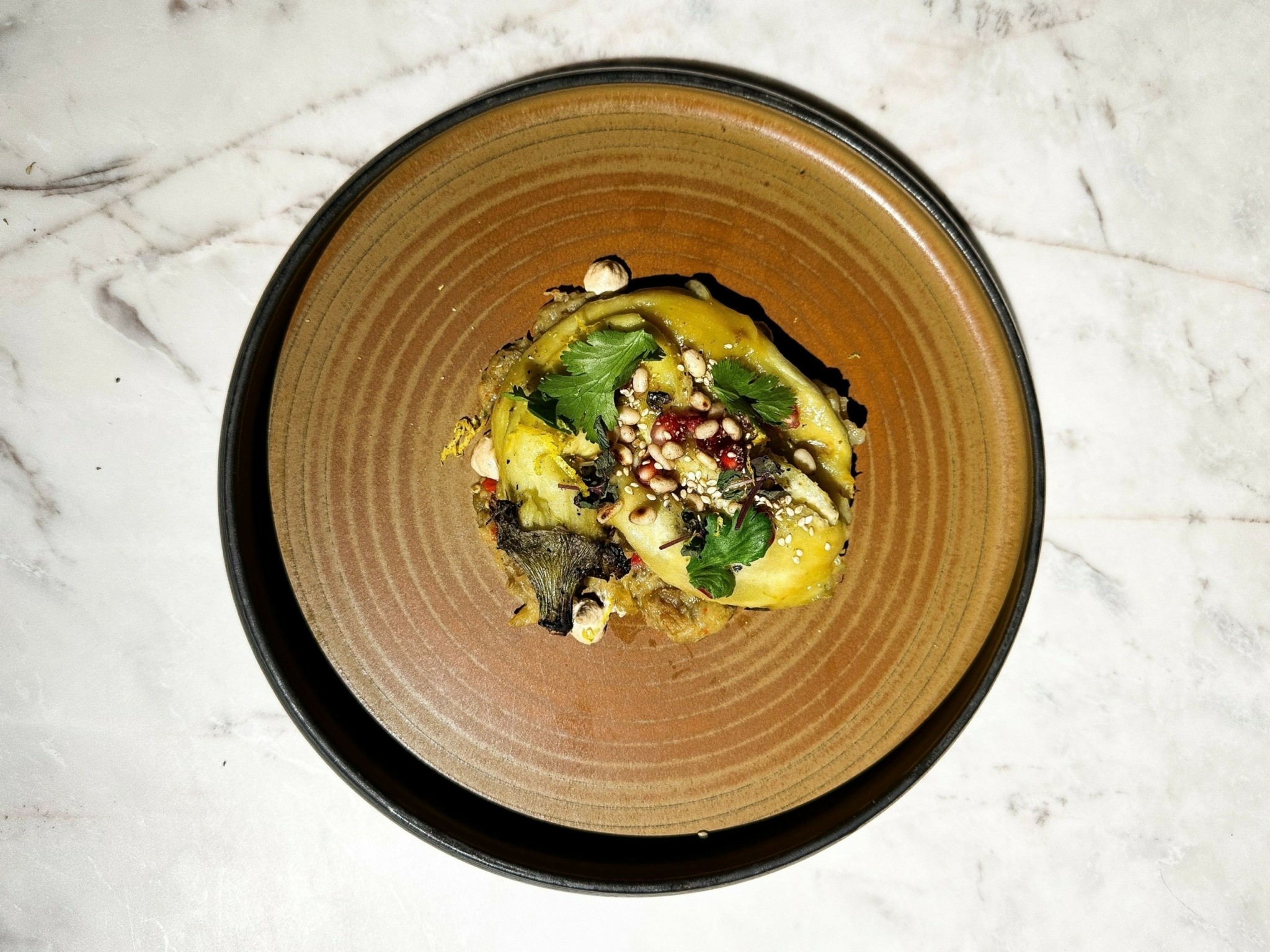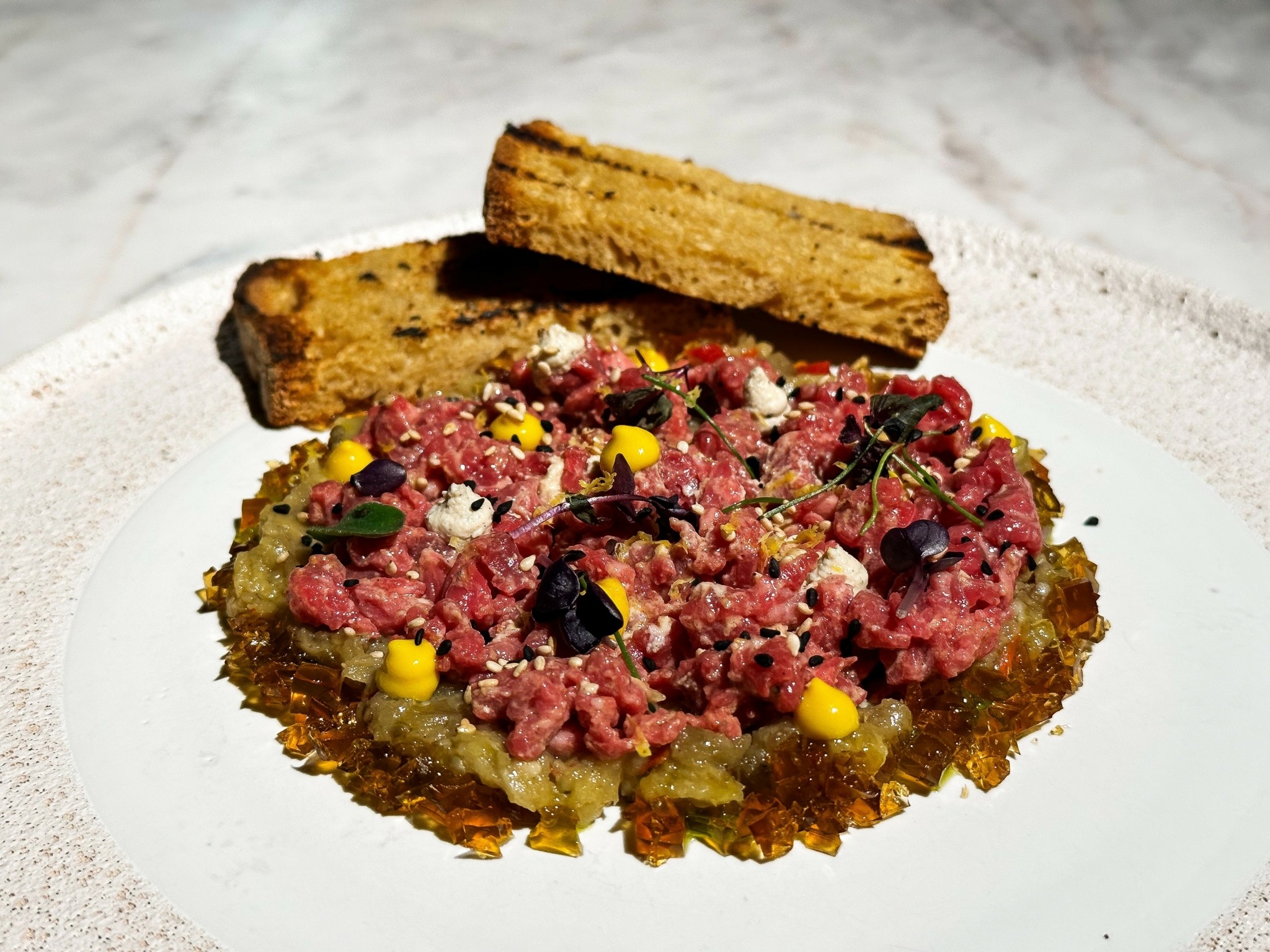 Στη La Meat Maison κανείς δεν πρέπει να χάσει την ευκαιρία να απολαύσει το olive-fed Wagyu, σε όσες το δυνατόν περισσότερες μορφές γίνεται. Ετσι από το τραπέζι μας δεν έλλειψε το ευφάνταστο olive-fed Wagyu καρπάτσιο, στολισμένο με λεπτοκομμένες φέτες γκρέιπφρουτ, μαγιονέζα από λάιμ, εσαλότ μαγειρεμένα με miso και βούτυρο, μαρμελάδα τσίλι, μουστάρδα, φύλλα παρμεζάνας, φρέσκο πιπέρι και ξύσμα λάιμ, που του πρόσθεταν εξαιρετικές όξινες και πικάντικες γευστικές νότες. Με δημιουργικές πινελιές παρουσιάστηκε και η ψητή μελιτζάνα – όμορφα τοποθετημένη σε λεπτό στρώμα μελιτζανοσαλάτας – με honey miso, κουκουνάρι, ρόδι, σουσάμι, κόλιανδρο και dressing από ταχίνι.