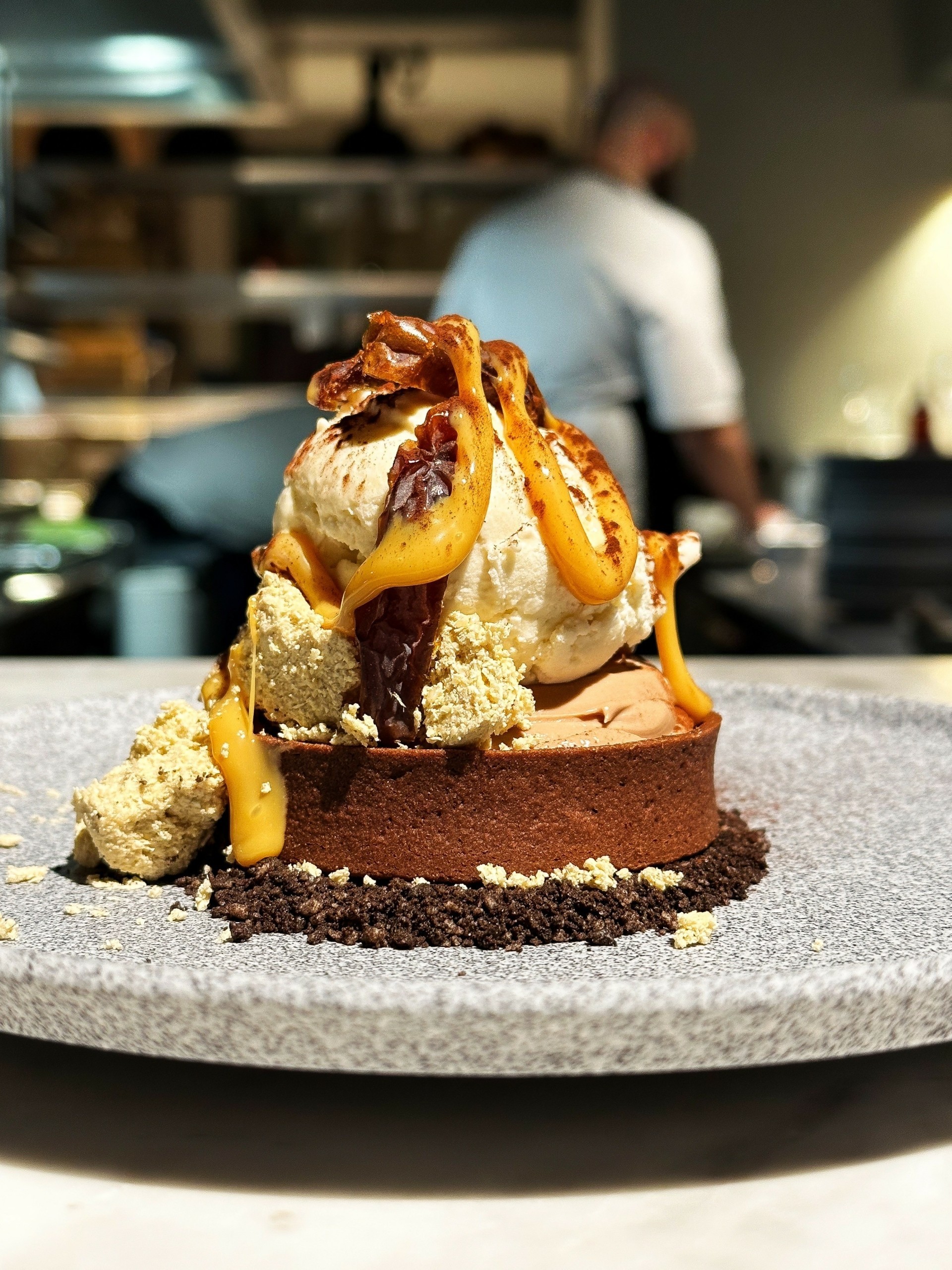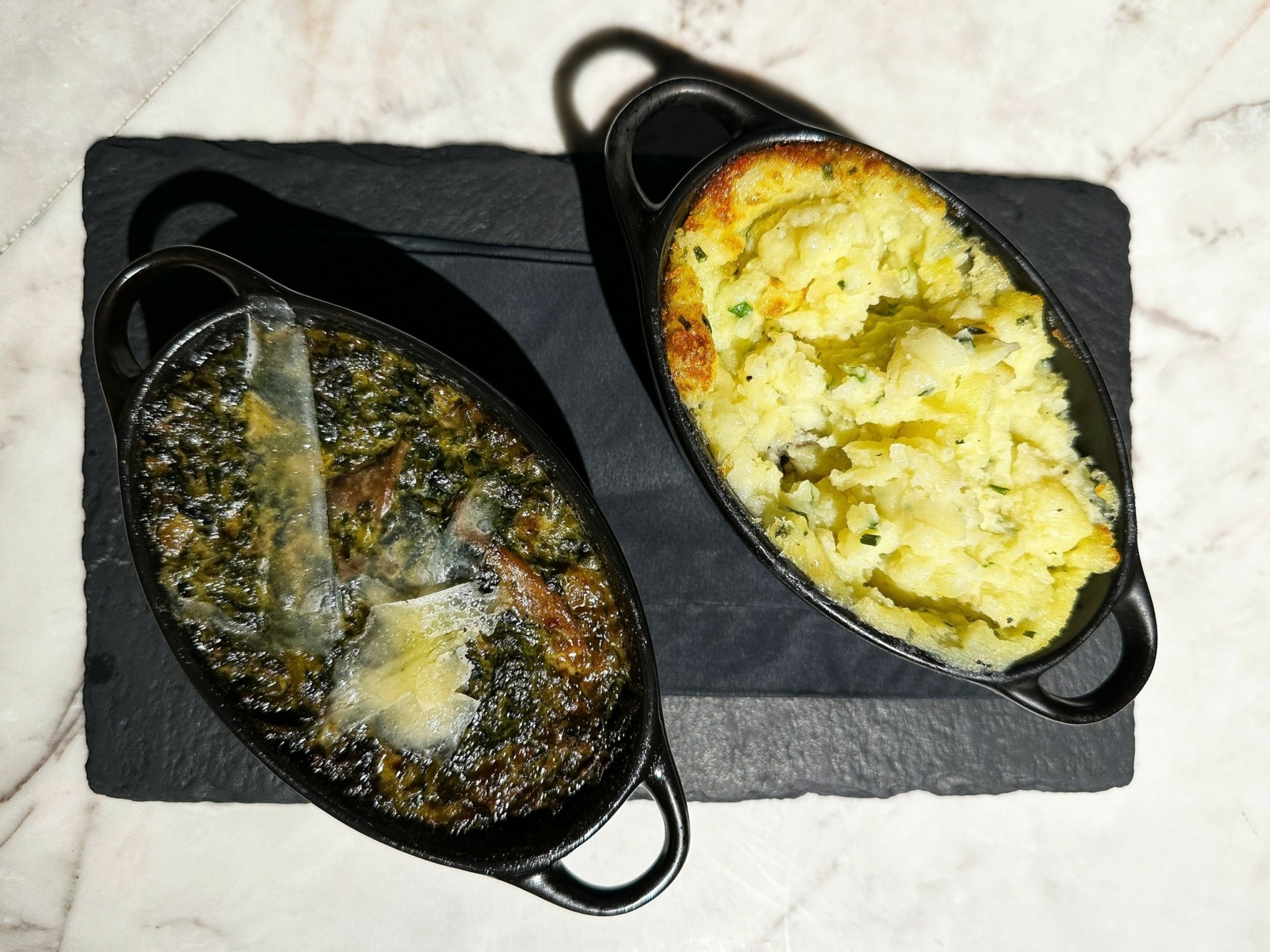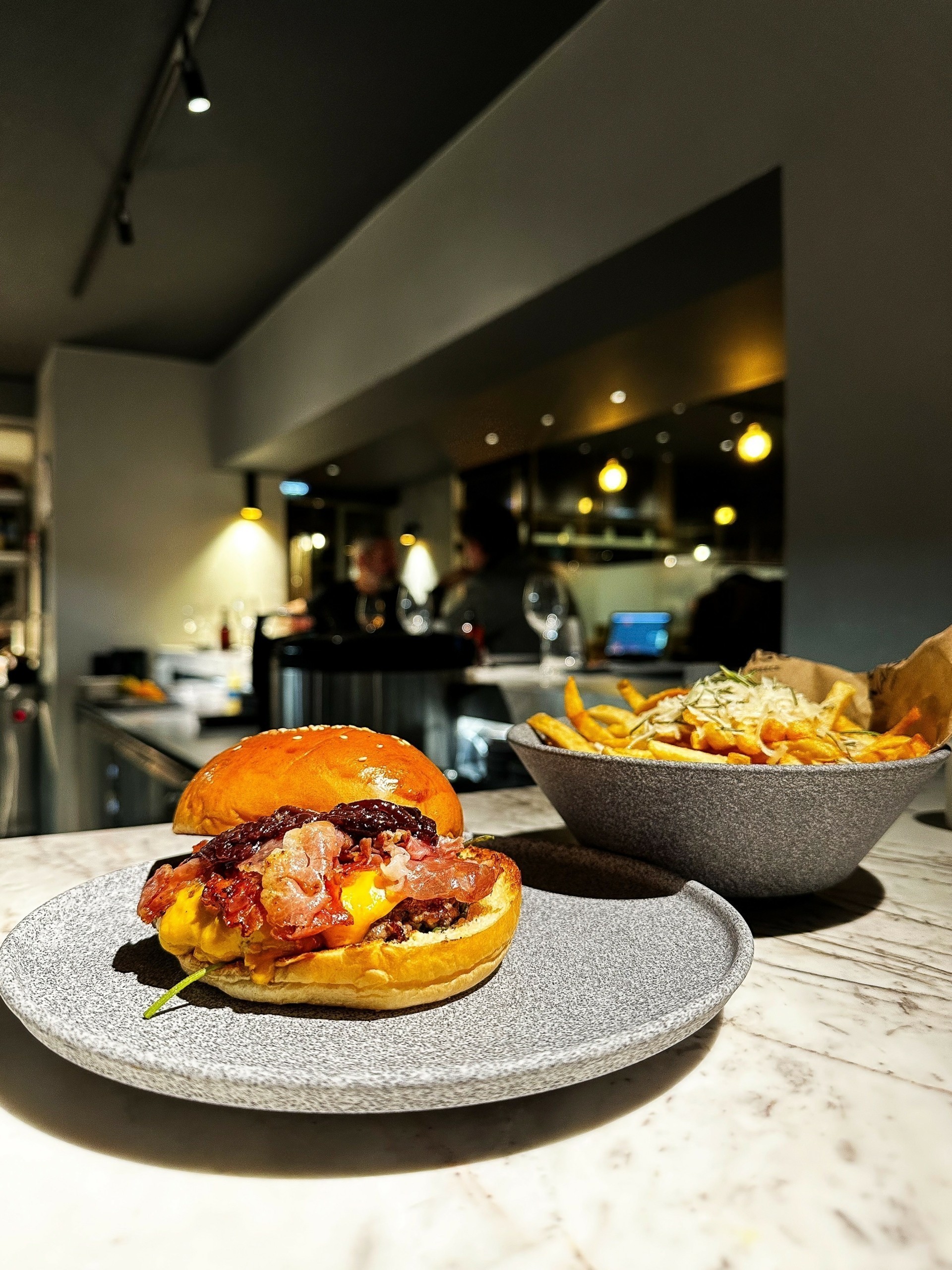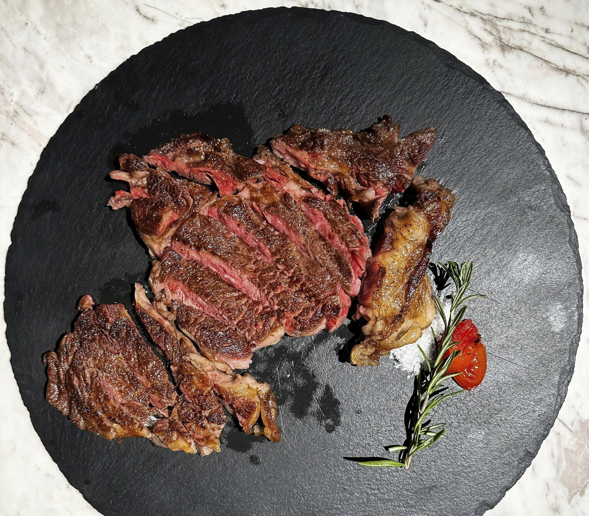 Η μελιτζανοσαλάτα, περιστοιχισμένη με κομματάκια από τζελ ponzu, έκανε την εμφάνισή της και στο olive-fed Wagyu rump steak ταρτάρ, όπου καπνιστή μαγιονέζα και φρέσκα μυρωδικά πρόσθεταν πικάντικες και γήινες γεύσεις και αρώματα. Επικής νοστιμιάς ήταν το πληθωρικό μπέργκερ με olive-fed Wagyu μπιφτέκι, μπέικον, τσένταρ, καραμελωμένα κρεμμύδια και πίκλες – σαφώς ένα από τα καλύτερα της πόλης. Η Wagyu ταλιάτα από τη φάρμα 2GR ήταν μακράν η καλύτερη που έχουμε δοκιμάσει ποτέ – και έχουμε δοκιμάσει πολλές! Εξίσου καταπληκτικό βέβαια ήταν και το olive-fed Wagyu ribeye – ζουμερό, αρωματικό, φινετσάτα βουτυράτο και εξαίσια ψημένο.