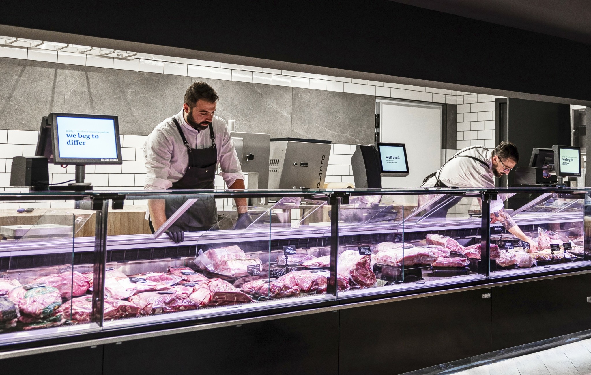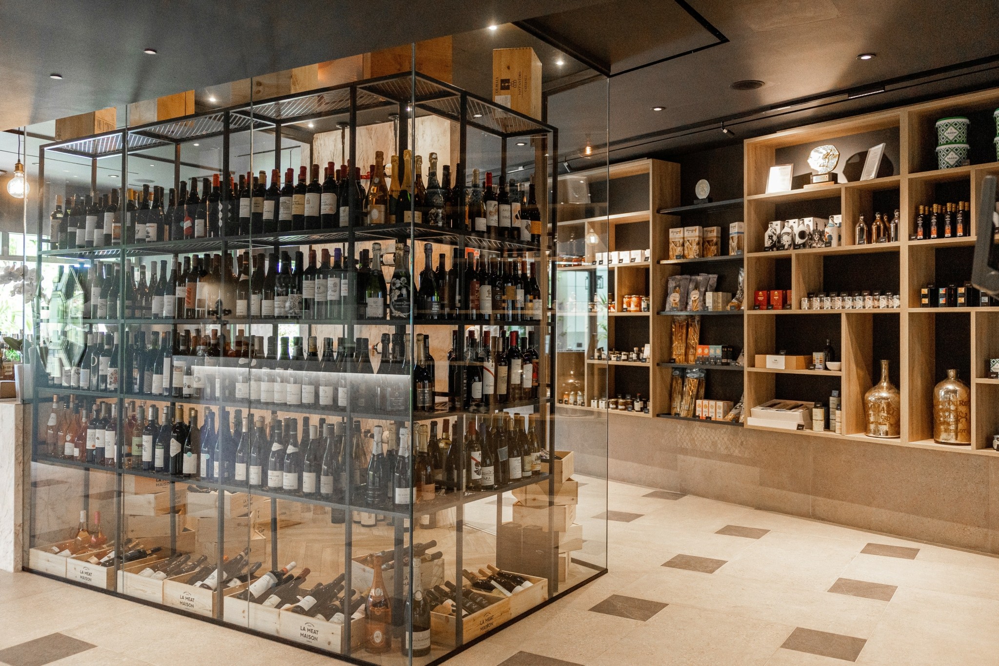 Τα πολύτιμα αγαθά του κρεοπωλείου εκτίθενται περίτρανα σε τρεις απαστράπτουσες βιτρίνες, που στέκονται δίπλα η μια στην άλλη. Η πρώτη φέρει κορυφαίες, σε παγκόσμια κλίμακα, κοπές, ανάμεσά τους και μοναδικό olive-fed Wagyu, Wagyu από τη φάρμα 2GR της Αυστραλίας, Kobe με καταπληκτικό ενδομυϊκό λίπος και Black Angus από τη φάρμα Creekstone των ΗΠΑ. Στη δεύτερη φιγουράρουν σπάνιες κοπές ωρίμανσης, ενώ στην τρίτη μια εξαιρετική ποικιλία νωπών, μαριναρισμένων και έτοιμων για μαγείρεμα κρεάτων, που βασίζονται σε δοκιμασμένες συνταγές της La Meat Maison, όπως χοιρινό κρέας ελληνικής και ολλανδικής προέλευσης, ελληνικό και νεοζηλανδέζικο grass-fed αρνί, ελευθέρας βοσκής πουλερικά St. Sever, Black Angus μαριναρισμένο σε σάλτσα teriyaki αλλά και chimichurri, stir fry μοσχάρι και μπέργκερ από olive-fed Wagyu.