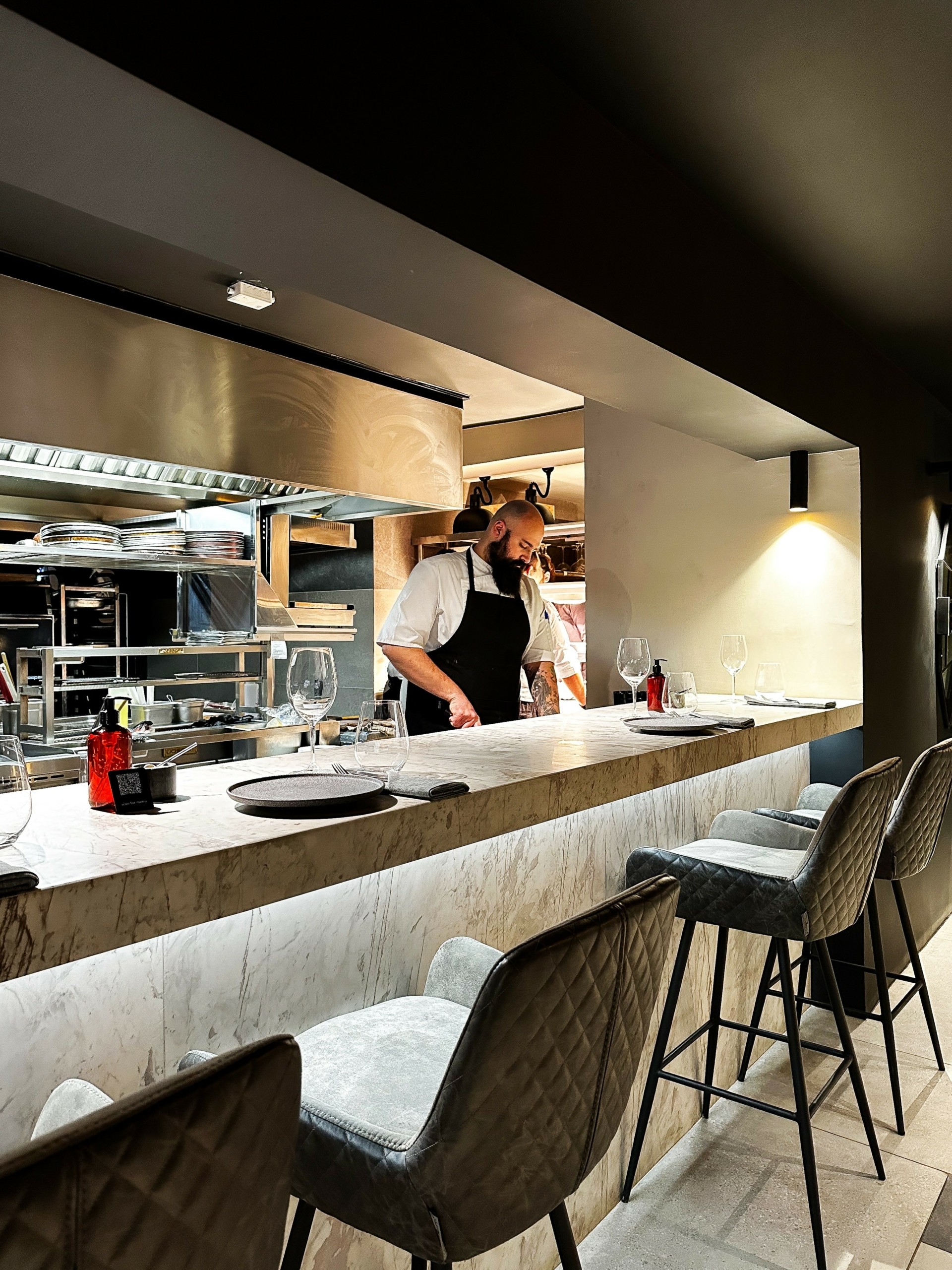 Η χρήση ενεργών συστατικών της ελιάς αυξάνει κατακόρυφα τη γεύση umami και την ένταση στο χρώμα του κρέατος, κάνοντάς το παράλληλα πιο υγιεινό και αισθητά πιο τρυφερό, ζουμερό, αρωματικό, και ντελικάτο. Ως λάτρεις των θέσεων πρώτης σειράς στις υψηλού επιπέδου γευστικές παραστάσεις, επιλέξαμε για το γεύμα μας τα αναπαυτικά ψηλά σκαμπό και τη μπάρα μπροστά από την ανοιχτή κουζίνα. Μπορέσαμε έτσι να θαυμάσουμε την ετοιμασία των πιάτων του μενού, η επιμέλεια του οποίου ανήκει στον executive chef Δημήτρη Κατριβέση (Thama) και να διαπιστώσουμε εξ ιδίοις όμμασι αυτό που μας είπε χαμογελώντας ο head chef Βασίλης Φουντουκίδης, όταν πρωτοφθάσαμε στη La Meat Maison: «στην κουζίνα είμαστε μια οικογένεια».