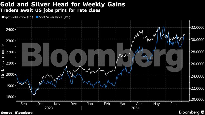 H τιμή σποτ του χρυσού σημείωσε άνοδο 0,3% στα 2.363,67 δολάρια ανά ουγγιά στη 1:30 μ.μ. στη Σιγκαπούρη, με τον δείκτη Bloomberg Dollar Spot Index και τις αποδόσεις του 10ετούς αμερικανικού δημοσίου να βρίσκονται σε πορεία εβδομαδιαίας πτώσης. Το ασήμι σημειώνει άνοδο σχεδόν 5% αυτή την εβδομάδα, ενώ η πλατίνα και το παλλάδιο έχουν επίσης κερδίσει έδαφος.