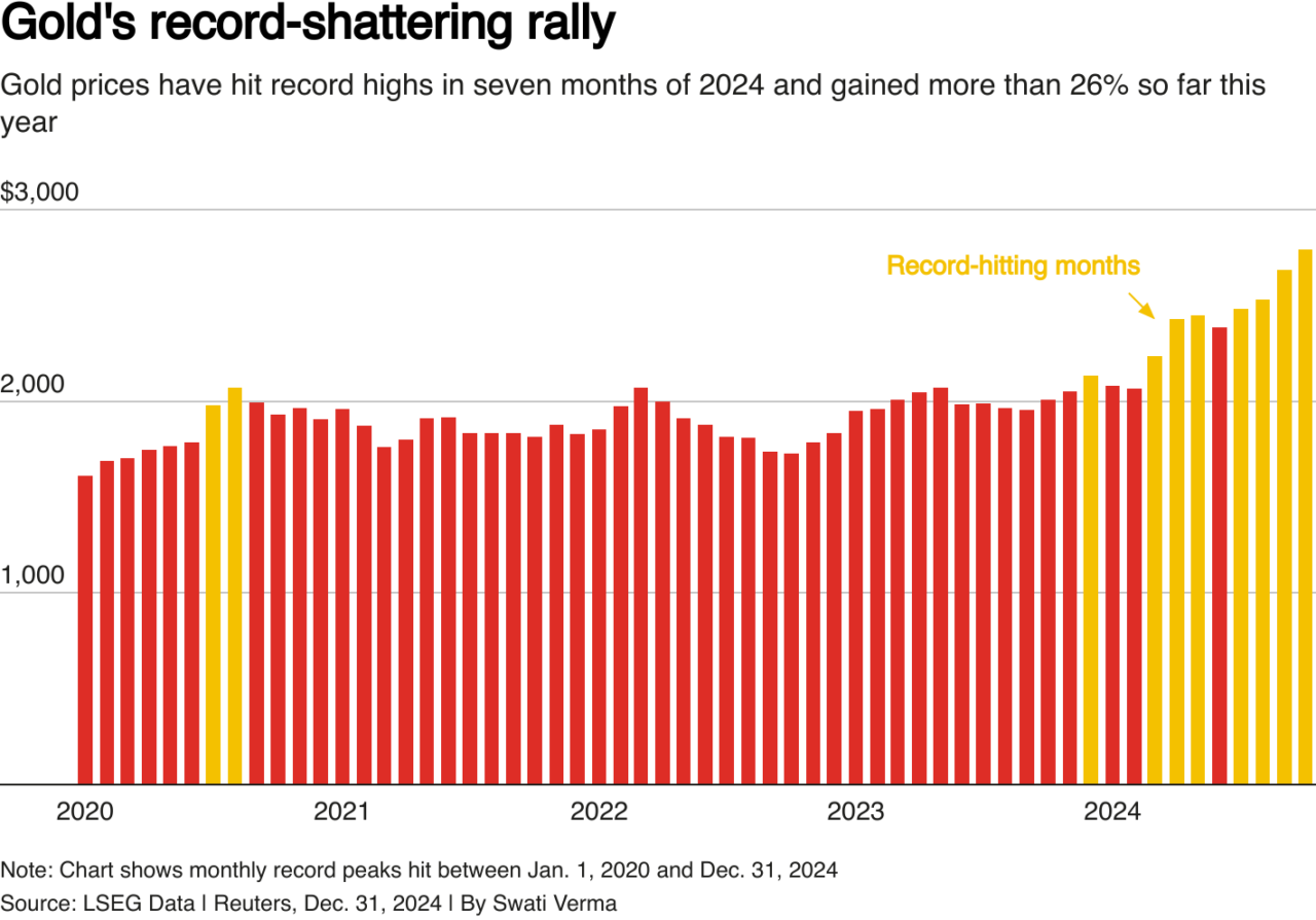 Ως ένα από τα περιουσιακά στοιχεία με τις καλύτερες επιδόσεις του 2024, οι τιμές των ράβδων έχουν κερδίσει σχεδόν 27% από την αρχή του έτους, το μεγαλύτερο ετήσιο άλμα από το 2010, ενώ κατέκτησαν πολλαπλά ρεκόρ για να κλείσουν στο υψηλό των 2.790,15 δολαρίων στις 31 Οκτωβρίου.