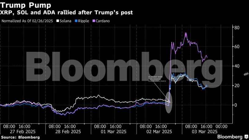 Ο δείκτης Bloomberg Galaxy Crypto Index κατέγραψε πτώση της τάξης σχεδόν του 28% τον Φεβρουάριο. Η πτώση άσκησε πίεση στον Τραμπ, ο οποίος επέστρεψε στον Λευκό Οίκο αφού ο κλάδος τον «έλουσε» με προεκλογικές δωρεές και επαίνους. Ακόμα και η ανατροπή της Επιτροπής Κεφαλαιαγοράς από μια πολυετή καταστολή δεν είχε καταφέρει να ανακόψει το sell-off, το οποίο πολλοί απέδωσαν εν μέρει στη νευρικότητα για τους εμπορικούς δασμούς του Τραμπ και τις δραματικές κινήσεις για την κατάργηση των κυβερνητικών προγραμμάτων.