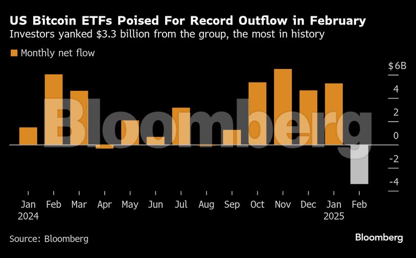 Η πτώση του bitcoin τον Φεβρουάριο αντιστοιχούσε με τη μεγαλύτερη μηνιαία καθαρή εκροή για την ομάδα των spot-Bitcoin ETF από τότε που ξεκίνησαν τον Ιανουάριο του 2024, με εκροή περίπου 3,3 δισεκατομμυρίων δολαρίων, σύμφωνα με τα στοιχεία που συγκέντρωσε το Bloomberg.