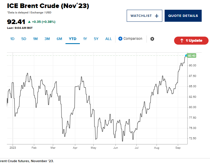 Τα συμβόλαια μελλοντικής εκπλήρωσης του ICE Brent Crude με λήξη τον Νοέμβριο του 2023 ενισχύθηκαν νωρίτερα κατά 0,22%, ξεπερνώντας και πάλι τα 90 δολ/βαρέλι και συγκεκριμένα τα $92,26 στις 7 π.μ. ώρα Λονδίνου.