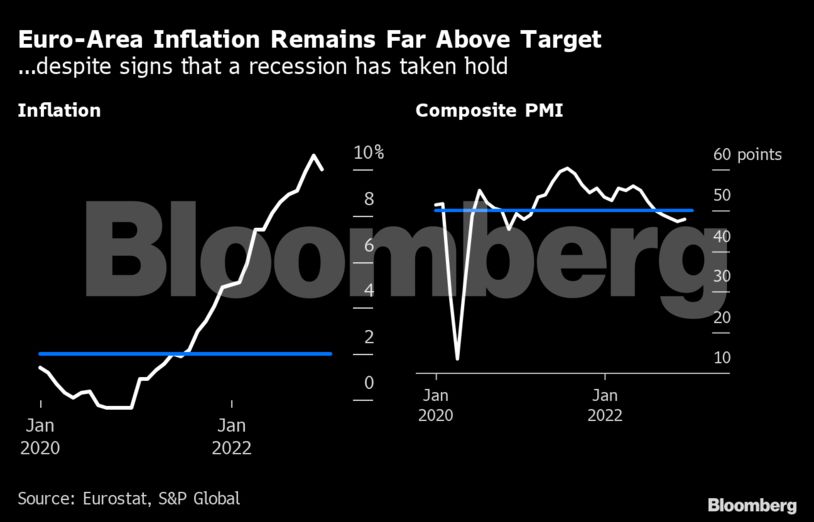 Οι πληθωριστικές πιέσεις ναι μεν υποδεικνύουν πτωτική τάση, αλλά ο πληθωρισμός στην Ευρωζώνη κυμαίνεται ακόμα κοντά στο 10%. Σύμφωνα με την αναλυτή του Bloomberg Economics, Μαέβα Κάζιν, «οποιαδήποτε ένδειξη χαλάρωσης των πληθωριστικών στοιχείων αντισταθμίζεται από το γεγονός πως η πίεση παραμένει ακόμα υψηλή».