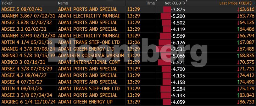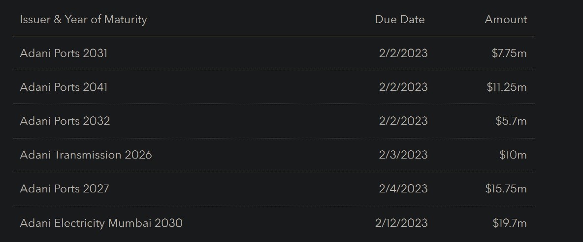 To Adani Group πρέπει να προχωρήσει στην εξόφληση κουπονιών ομολόγων σε δολάρια ύψους $34,7 εκατομμύρια αυτή την εβδομάδα. Η Adani Ports & Special Economic Zone Ltd., καλείται να εξοφλήσει $24,7 εκατ. σε κουπόνια τριών ομολόγων, ενώ η Adani Transmission Ltd. καλείται να εξοφλήσει $10 εκατ.