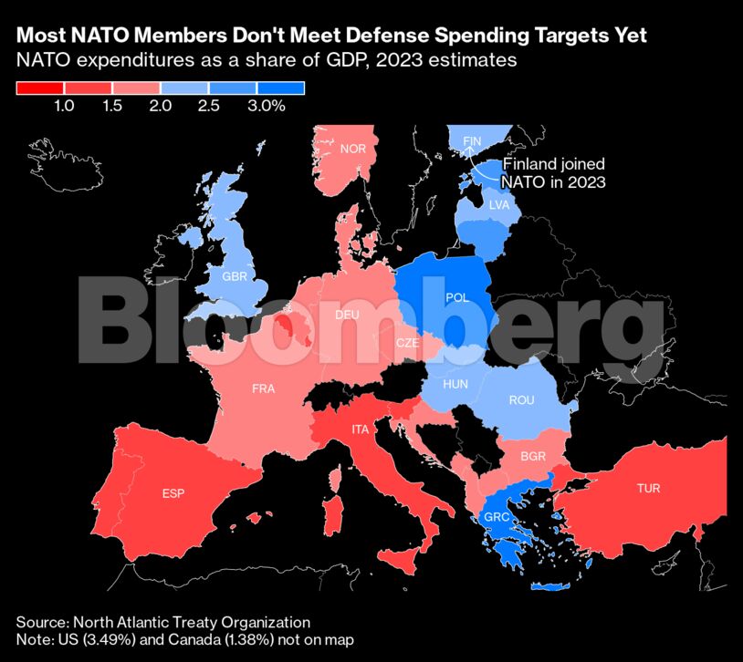 Οι χώρες-σύμμαχοι του ΝΑΤΟ, δη οι ευρωπαϊκές χώρες, μείωσαν σημαντικά τις αμυντικές δαπάνες μετά το τέλος του Ψυχρού Πολέμου, αυξάνοντάς τες το 2014 όταν η Ρωσία προσάρτησε την Κριμαία. Η νέα, πλήρους κλίμακας εισβολή της Ρωσίας τον Φεβρουάριο του 2022 επιτάχυνε τη στροφή αυτή, κυρίως στη Γερμανία, η οποία διαχρονικά κρατούσε τις στρατιωτικές δαπάνες της χαμηλές.