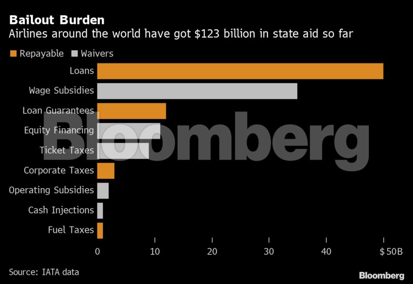 Σύμφωνα με τον IATA, ο οποίος αντιπροσωπεύει 290 αεροπορικές εταιρείες, η αεροπορική βιομηχανία έχει λάβει 123 δισεκατομμύρια δολάρια σε διάφορες μορφές κρατικής ενίσχυσης. Από αυτό το ποσό, 67 δισεκατομμύρια δολάρια ή 55% είναι επιστρεπτέα, δημιουργώντας μια βόμβα χρέους για τις αεροπορικές εταιρείες που επιδιώκουν να επιβιώσουν από σημαντικά μειωμένα έσοδα σε μια συρρικνωμένη ταξιδιωτική αγορά.