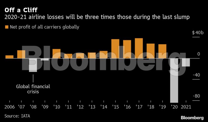 Ο ΙΑΤΑ επισημαίνει ότι οι αεροπορικές εταιρείες αναμένεται να χάσουν 100 δισεκατομμύρια δολάρια φέτος και τον επόμενο χρόνο, κάτι το οποίο αποτυπώνεται στο αμέσως επόμενο γράφημα. Αυτό επισκιάζει τις απώλειες 31 δισεκατομμυρίων δολαρίων κατά τη διάρκεια της ύφεσης 2008-2009, ενώ θεωρείται ότι είναι η χειρότερη οικονομική ύφεση μετά τη Μεγάλη Ύφεση της δεκαετίας του 1930.