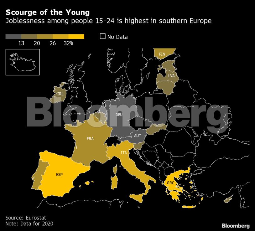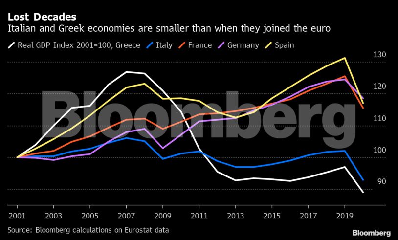 Μετά από την οικονομική κρίση, ήρθε και η πανδημία για να χειροτερεύσει τα πράγματα. Η οικονομία της Ισπανίας συρρικνώθηκε κατά 10% το 2020. Στην Ιταλία, λόγω της πανδημίας, το πραγματικό ΑΕΠ είναι χαμηλότερο από ό,τι ήταν όταν η χώρα εισήλθε στο ευρώ.