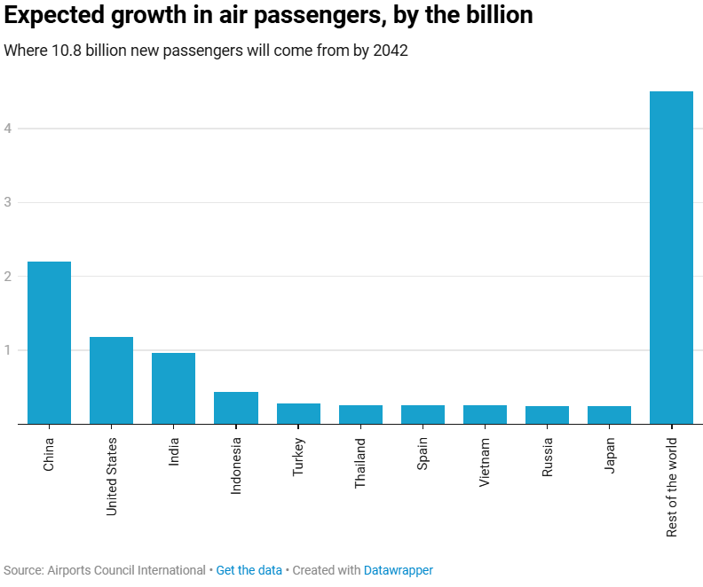 Μεγάλο μέρος αυτής της αύξησης αναμένεται να προέλθει από την Ασία-Ειρηνικό. Τα επόμενα 20 χρόνια, ο εμπορικός οργανισμός αεροδρομίων εκτιμά ότι περισσότερο από το ένα τρίτο των νέων επιβατών θα προέρχεται από τρεις χώρες: Κίνα, Ινδία και Ινδονησία.