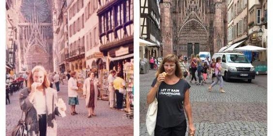 Επιστρέφοντας στο Στρασβούργο, στη Χαϊδελβέργη και στην Κολωνία της Γερμανίας, τα μέρη που επισκέφθηκε για πρώτη φορά ως 27χρονη, η Λίζα έβγαλε ακριβώς τις ίδιες φωτογραφίες και μάλιστα με την ίδια πόζα.