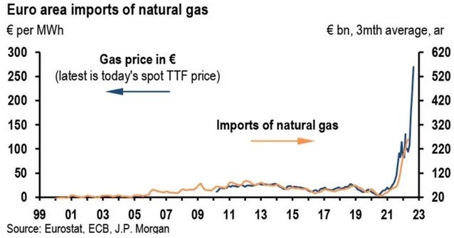 Σύμφωνα με τον αναλυτή της JPMorgan, Greg Fuzesi, το κόστος της εισαγωγής ενέργειας από την Ευρώπη έχει υπερτετραπλασιαστεί τους τελευταίους μήνες, από 200 δισ ευρώ (1,6% του ΑΕΠ της Ευρωζώνης) σε άνω των 800 δισ ευρώ (6,4% του ΑΕΠ της Ευρωζώνης).