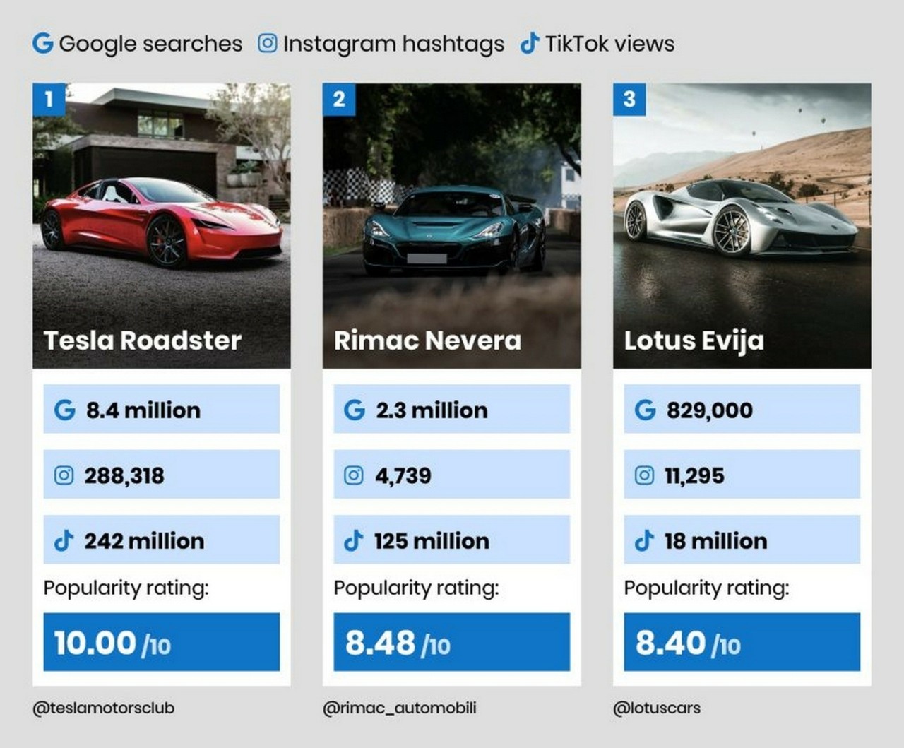 Για να έχουμε μία εικόνα, το απίστευτο Rimac Nevera, το οποίο μάλιστα βρίσκεται στην παραγωγή, απέχει έτη φωτός. Για την ακρίβεια έχει 2,3 εκατ. αναζητήσεις στην Google, μόλις 4.379 hastags στο Instagram και 125 εκατ. views στο TikTok. Στην τρίτη θέση βρίσκεται η Lotus Evija με ακόμα πιο χαμηλά νούμερα.