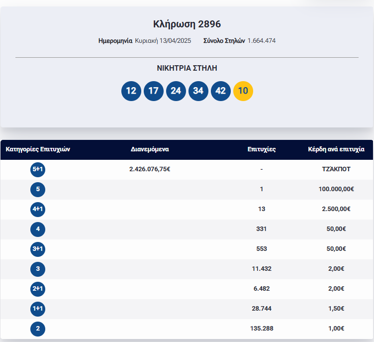 Οι τυχεροί αριθμοί στην κλήρωση Τζόκερ σήμερα είναι: 12, 17, 24, 34, 42 και τζόκερ ο αριθμός 10.