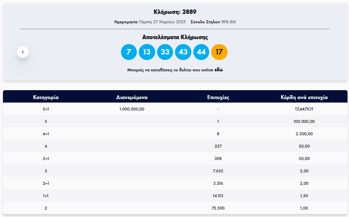 Oλοκληρώθηκε η κλήρωση του Τζόκερ που πραγματοποιήθηκε την Κυριακή, 27 Μαρτίου, με κέρδη 1 εκατ. ευρώ.