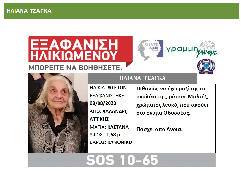 Η Ηλιάνα Τσαγκά, 80 ετών, εξαφανίστηκε από το σπίτι της, στο Χαλάνδρι Αττικής, το πρωί της 08/08/23. Η ηλικιωμένη, έβγαλε βόλτα το σκυλάκι της, ράτσας Μαλτέζ, χρώματος λευκό, που ακούει στο όνομα Οδυσσέας. Έκτοτε, δεν έχει δώσει σημεία ζωής.