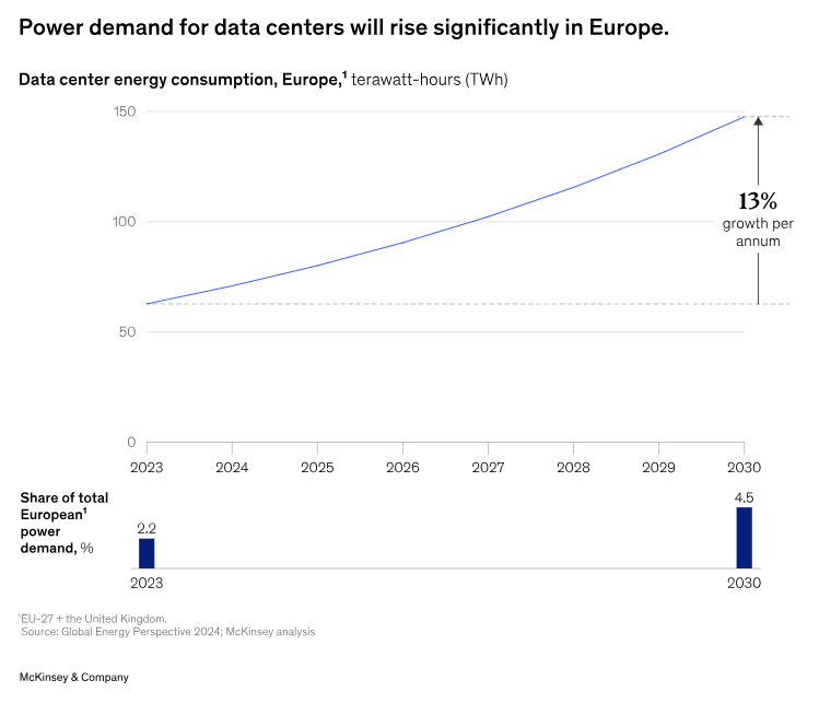 Στην ίδια έρευνα, η ICIS εκτιμά «ότι μέχρι το 2035, η ζήτηση ενέργειας των ευρωπαϊκών κέντρων δεδομένων θα έχει αυξηθεί σε 236 TWh ή 5,7% της συνολικής ευρωπαϊκής ζήτησης ενέργειας». Ανάλογα είναι τα συμπεράσματα σχετικής έκθεσης της McKinsey & Company, που προβλέπει ότι η κατανάλωση ηλεκτρικής ενέργειας από τα data centers θα φτάσει σε 150 TWh έως το 2030.
