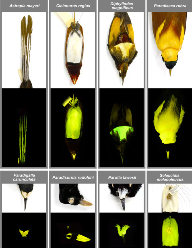 Οι επιστήμονες ξεκίνησαν πριν 10 χρόνια να μελετούν τα πτηνά σε δείγματα που περιλαμβάνονται στην πλούσια συλλογή του Μουσείου Φυσικής Ιστορίας. Εντούτοις, μόνο πρόσφατα ερευνητές κατέληξαν πως πράγματι τα φτερά των παραδείσιων πτηνών απορροφούν την υπεριώδη ακτινοβολία και στην πορεία την εκπέμπουν σε απόχρωση έντονου πρασινο-κίτρινου φωτός.
