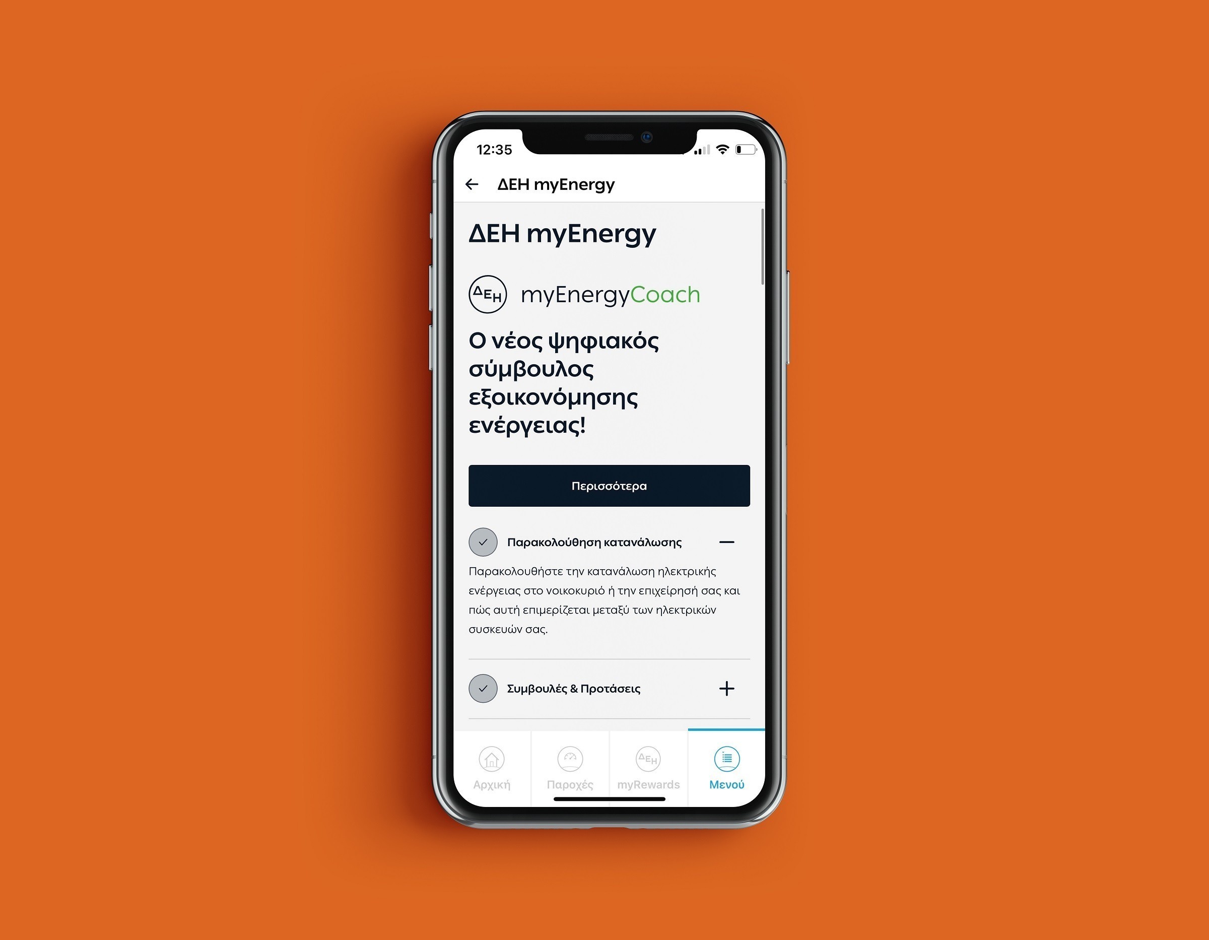 Από τα πιο σημαντικά χαρακτηριστικά του νέου myΔΕΗ είναι ότι ο myEnergy Coach, ο εξειδικευμένος σύμβουλος με λύσεις εξοικονόμησης ενέργειας και κόστους, είναι διαθέσιμος πάντα και από παντού. Με το ΔΕΗ myEnergyCoach, οι καταναλωτές μπορούν να παρακολουθούν την κατανάλωσή τους, να βλέπουν την ενεργειακή ανάλυση των συσκευών τους, να ανακαλύπτουν αποτελεσματικές συμβουλές για εξοικονόμηση ενέργειας, να λαμβάνουν προσωποποιημένες προτάσεις εξοικονόμησης και να επικοινωνούν απευθείας με έναν σύμβουλο ενέργειας στο κέντρο εξυπηρέτησης της ΔΕΗ.
