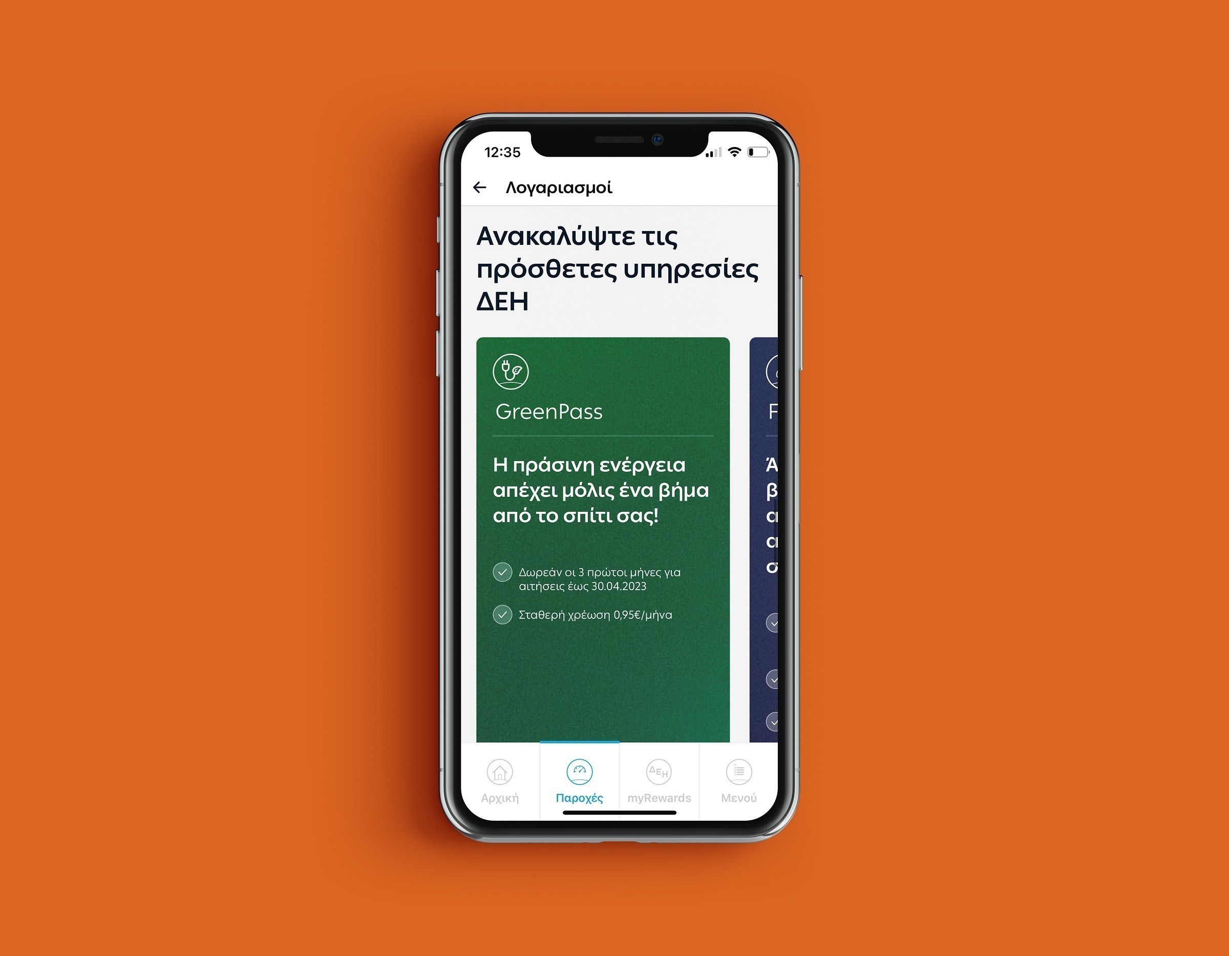 Για παράδειγμα, στο myΔΕΗ μπορεί να ενεργοποιηθεί ηλεκτρονικά το ΔΕΗ myHome 4All, το νέο οικιακό κυμαινόμενο πρόγραμμα της ΔΕΗ, που περιέχει δωρεάν την υπηρεσία GreenPass δίνοντας την δυνατότητα σε νέους και υφιστάμενους πελάτες να μειώσουν το ενεργειακό τους αποτύπωμα, ενώ τους ανταμείβει όταν εξοικονομούν ενέργεια.