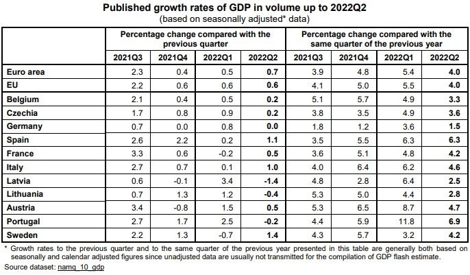 Καλύτερα των εκτιμήσεων ήταν τα στοιχεία του ΑΕΠ για τις χώρες της Ευρωζώνης, όπως κατέδειξε η πρώτη εκτίμηση της Eurostat για το β’ τρίμηνο του 2022.