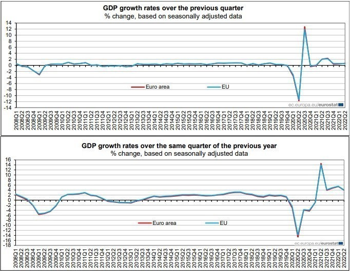 Σε ετήσιο επίπεδο δε (δηλαδή σε σύγκριση με το β’ τρίμηνο του 2021), η ανάπτυξη της οικονομίας καθορίστηκε στο 4% τόσο στη ζώνη του ευρώ όσο και στην Ε.Ε.