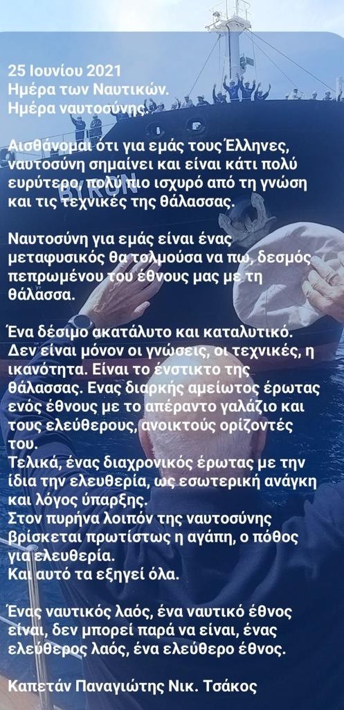 Αισθάνομαι ότι για εμάς τους Ελληνες ναυτοσύνη σημαίνει και είναι κάτι πολύ ευρύτερο πολύ πιο ισχυρό από τη γνώση και τις τεχνικές της θάλασσας λέει μεταξύ άλλων ο καπετάν Παναγιώτης Τσάκος στο μήνυμά του για την Ημέρα των Ναυτικών.