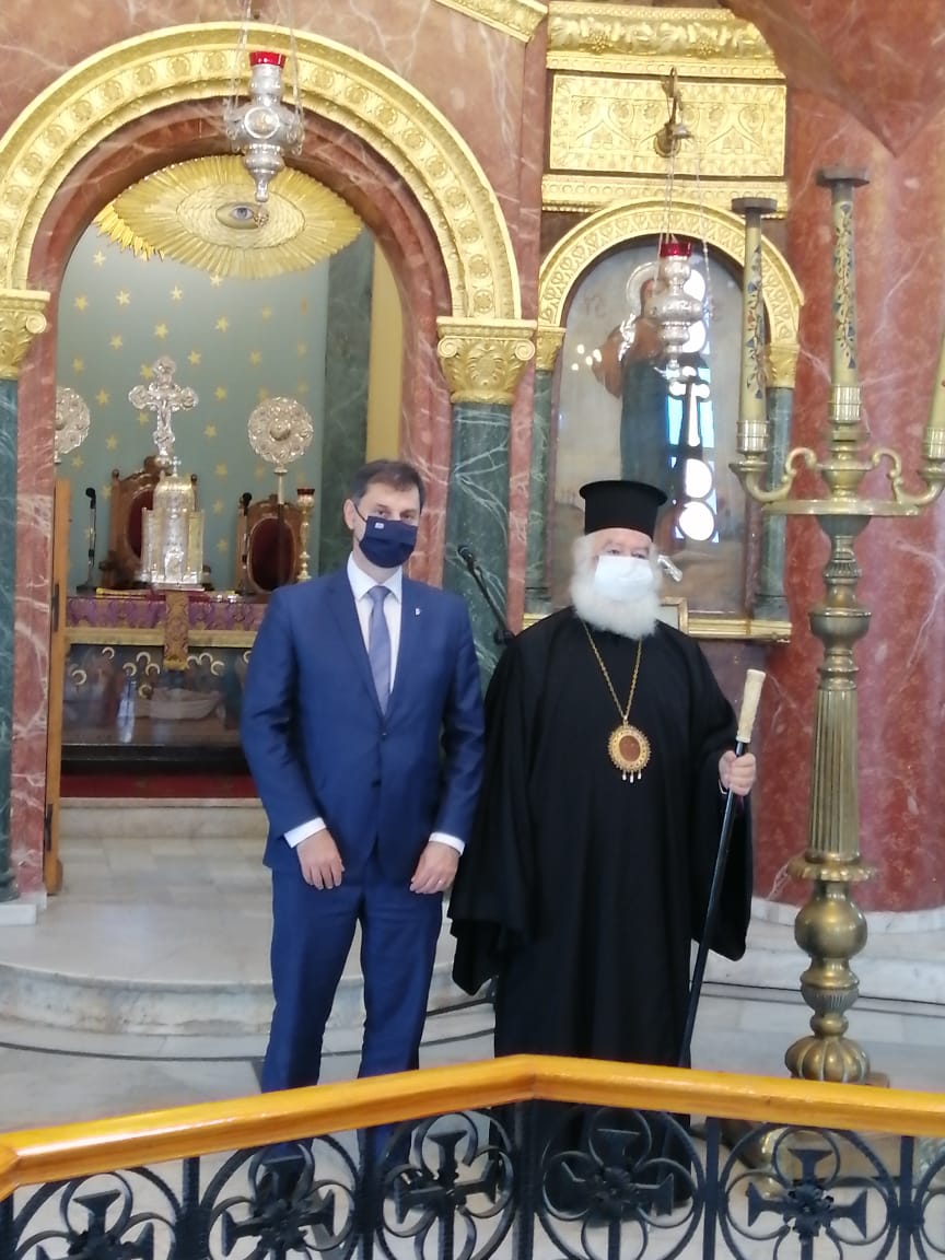 Νωρίτερα, στο πλαίσιο της επίσκεψής του στην Αίγυπτο, ο κ. Θεοχάρης έγινε δεκτός από την ΑΘΜ τον Πατριάρχη Αλεξανδρείας και πάσης Αφρικής κ.κ. Θεόδωρο Β` στη λεγόμενη και «Ροτόντα της Ανατολής», στην Ιερά Μονή του Αγίου Γεωργίου παλαιού Καΐρου. Κατά τη συνάντηση, ο κ. Θεοχάρης εξέφρασε τις ευχαριστίες του προς τον Πατριάρχη, σημειώνοντας χαρακτηριστικά: «Είστε ένας άοκνος και άγρυπνος φρουρός της Ορθοδοξίας μας, της ιστορίας αυτού του τόπου αλλά και της σύγχρονης προσπάθειας να φτάσει το Πνεύμα, ο Λόγος του Θεού, στα πέρατα της γης. Έχετε αυτόν τον πολύ δύσκολο ρόλο αλλά και το ρόλο να είστε η “γέφυρα” όχι μόνο της ιδιαίτερης πατρίδας σας, της Κρήτης, αλλά και όλης της Ελλάδας με την όμορφη χώρα της Αιγύπτου». Κατά τη διάρκεια της συνάντησης συζητήθηκαν θέματα θρησκευτικού τουρισμού και περαιτέρω ανάπτυξής του.