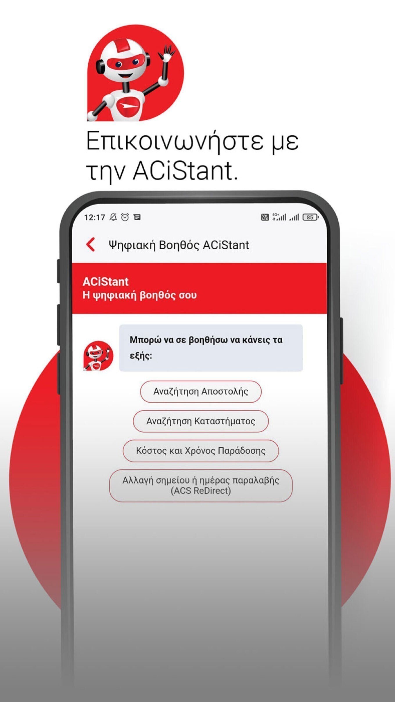 Στο ανανεωμένο ACS Mobile App θα βρεις και την ψηφιακή βοηθό μας, ACiStant, η οποία θα λύσει όλες τις απορίες σου σχετικά με την κάθε αποστολή σου. Ταυτόχρονα, οι πελάτες που διαθέτουν την κάρτα ACS Member, την έχουν πλέον και σε ψηφιακή μορφή εντός της εφαρμογής, ώστε να τη δείξουν στον διανομέα και να κερδίσουν εκπτώσεις ακόμα και στον χώρο τους.