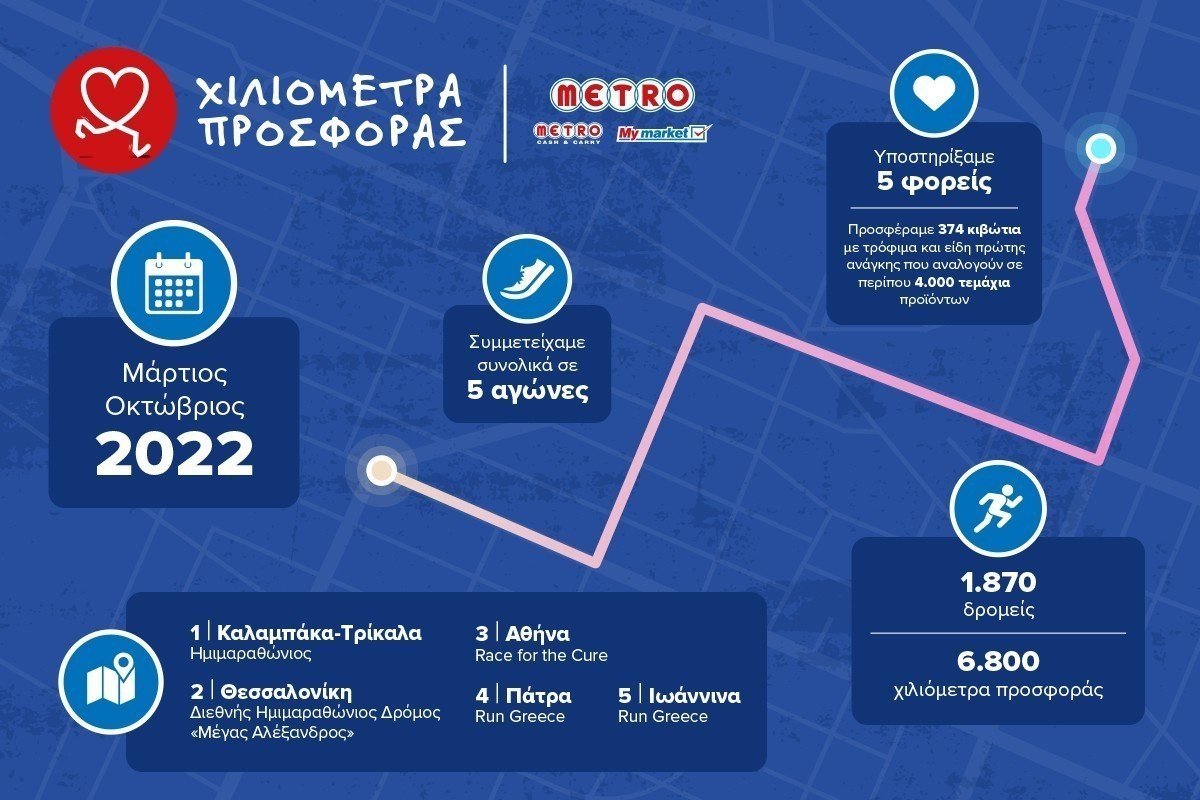 Συνολικά, από το 2017 έως το 2022 οι συμμετοχές της METRO Running Team έχουν ξεπεράσει τις 13.000, από αγώνες δρόμου σε όλη την Ελλάδα, και όλοι μαζί έχουν διανύσει 49.000 «Χιλιόμετρα Προσφοράς», στηρίζοντας με αυτόν τον τρόπο, ιδρύματα και φορείς επιστρέφοντας αξία στις τοπικές κοινωνίες!