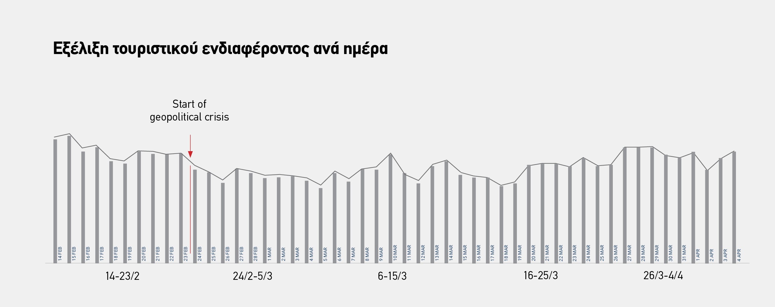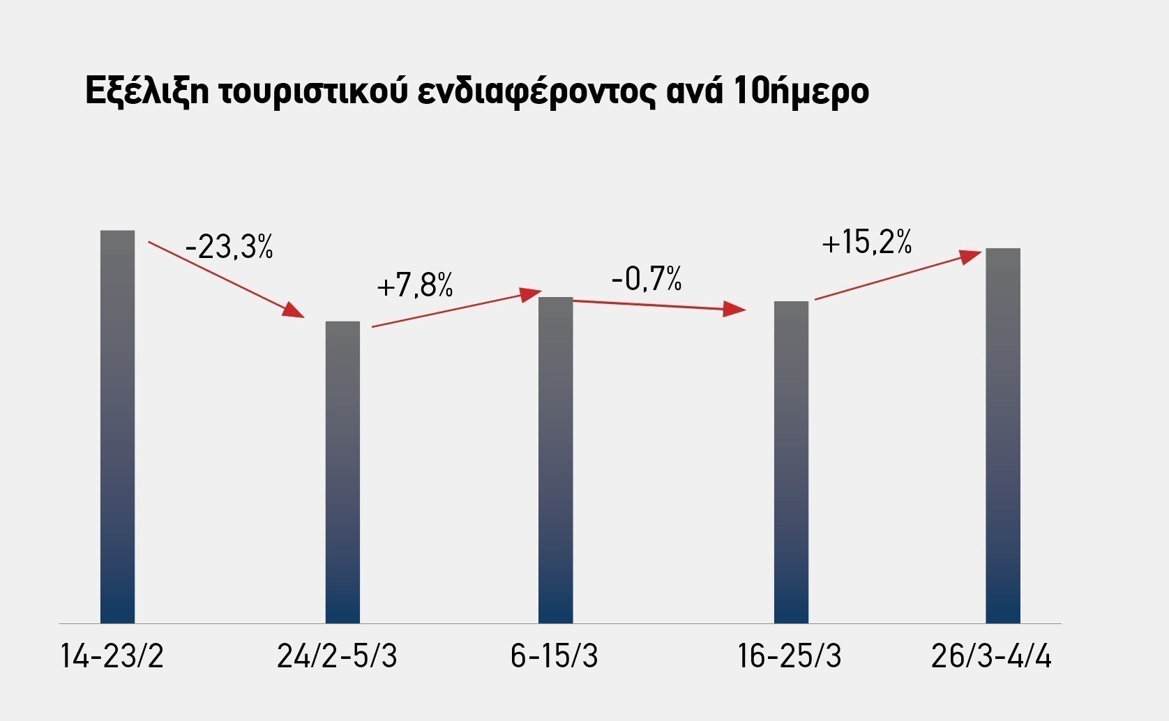 Σε διάστημα σαράντα ημερών κατόπιν των εξελίξεων στην Ευρώπη, η μείωση που παρατηρήθηκε στο τουριστικό ενδιαφέρον στο σύνολο των αγορών μελέτης άγγιξε συνολικά το -5,5%, με τις διακυμάνσεις ανά δεκαήμερο να παρουσιάζουν ιδιαίτερο ενδιαφέρον.