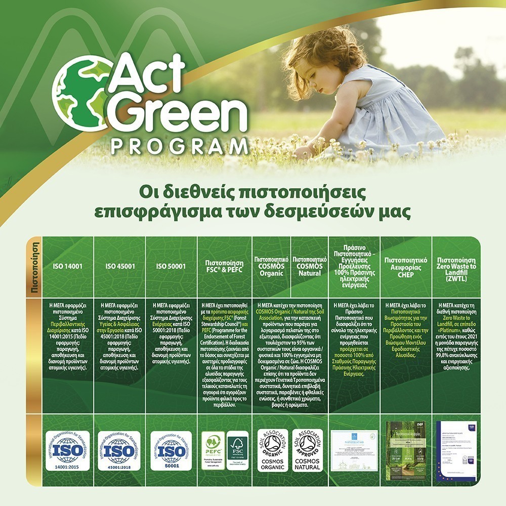 Υιοθετώντας τις αρχές της Κυκλικής Οικονομίας, μέσα από το στρατηγικό πρόγραμμα Act Green, η ΜΕΓΑ έχει εστιάσει στη συστηματική μείωση των υλικών που χρησιμοποιούνται στην παραγωγική διαδικασία (πρώτες ύλες, συσκευασίες, αναλώσιμα, νερό κλπ.), στη μείωση του παρθένου πλαστικού και στη χρήση ανακυκλώσιμων και ανακυκλωμένων υλικών συσκευασίας, στην 100% χρήση πράσινης ενέργειας, στη βέλτιστη αξιοποίηση των αποβλήτων των παραγωγικών διαδικασιών, ενώ ταυτόχρονα ενισχύει τις πρωτοβουλίες Βιώσιμης Ανάπτυξης, με στόχο πάντα ένα θετικό περιβαλλοντικό πρόσημο.