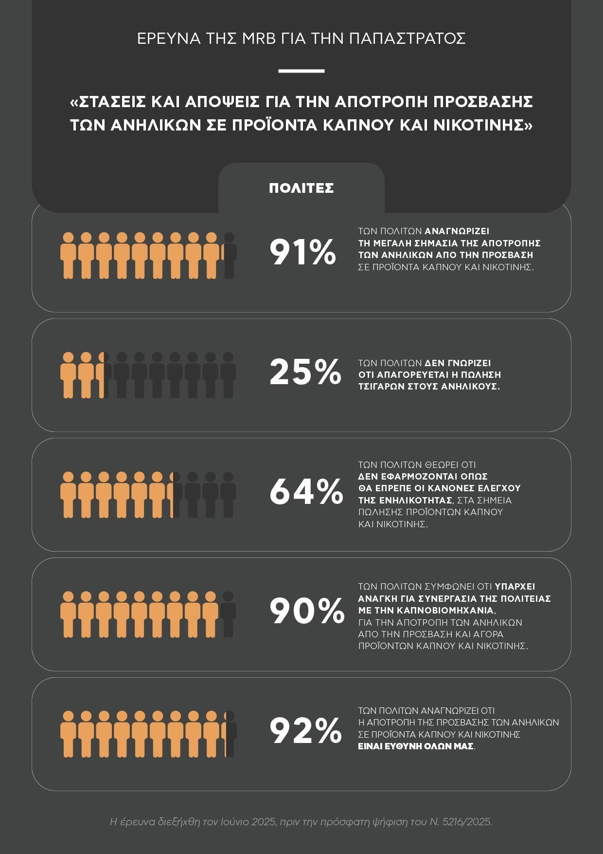 Η έρευνα ανέδειξε τόσο το εύρος του φαινομένου όσο και την κοινή πεποίθηση ότι η προστασία των ανηλίκων απαιτεί συντονισμένη δράση από όλους. Και τα δύο κοινά, σε ποσοστά 91% οι πολίτες και 98% οι λιανοπωλητές, αναγνωρίζουν τη μεγάλη σημασία της αποτροπής των ανηλίκων από την πρόσβαση και κατανάλωση προϊόντων καπνού και νικοτίνης.