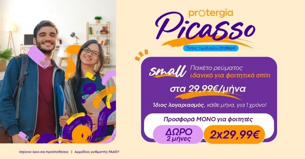 Η φοιτητική ζωή είναι γεμάτη νέες εμπειρίες, στιγμές ξεγνοιασιάς, αλλά φέρνει μαζί και τις πρώτες ευθύνες. Το Protergia Picasso Student έρχεται να διευκολύνει την καθημερινότητα των φοιτητών, προσφέροντας σταθερό λογαριασμό ρεύματος με μόνο 29,99€ τον μήνα.