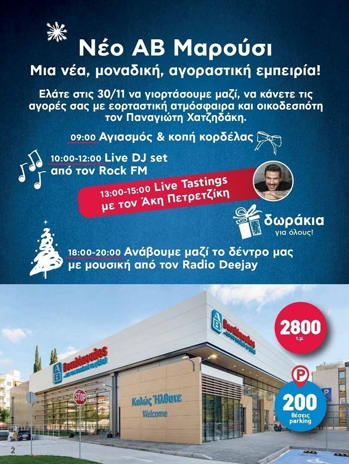 Η ΑΒ Βασιλόπουλος μας προσκαλεί να «φορέσουμε» την εορταστική μας διάθεση και να γιορτάσουμε παρέα την άφιξη του νέου της καταστήματος στο Μαρούσι, κατάστημα που ευελπιστεί ότι θα γίνει σημείο αναφοράς και συνάντησης στην περιοχή (Λ. Κηφισίας 34 και Οδός Ρωμανού Μελωδού, Παράδρομος Αμαρουσίου, κοντά στον Κόμβο Αμαρουσίου).