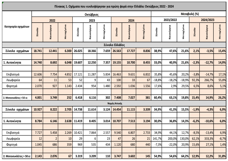 Τα καινούργια αυτοκίνητα ανέρχονται σε 10.700 έναντι 12.250 που κυκλοφόρησαν τον Οκτώβριο 2023, παρουσιάζοντας μείωση 12,7%.