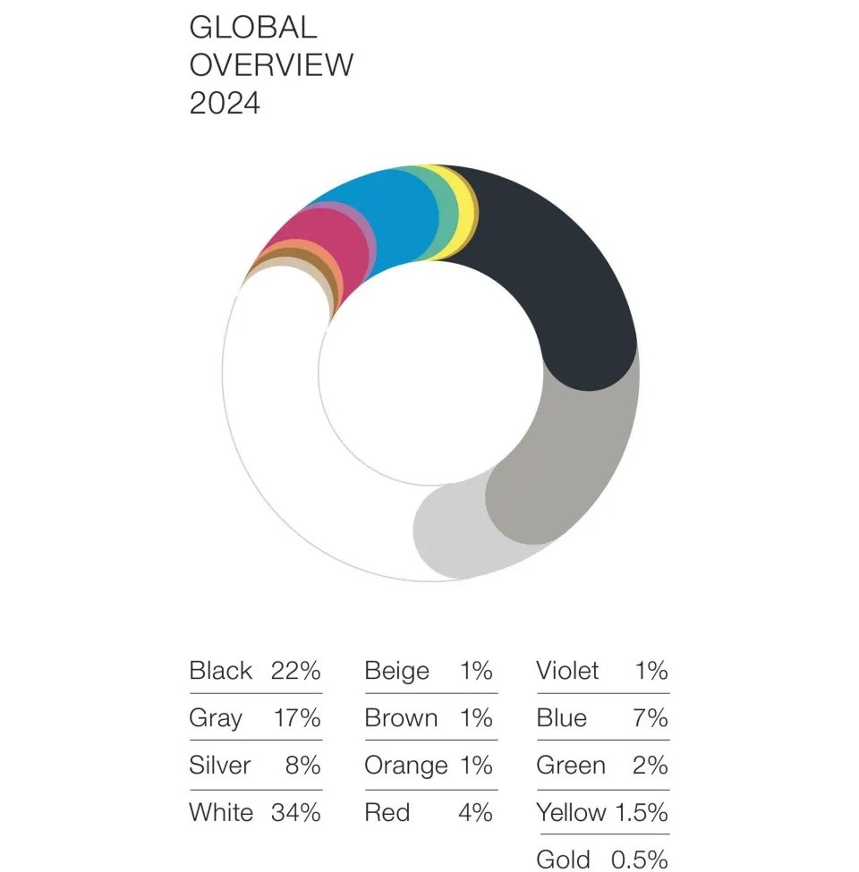 Σύμφωνα με τα στοιχεία της BASF Coatings, το λευκό παραμένει η πιο δημοφιλής επιλογή διεθνώς, με μερίδιο 34%, αν και η απήχησή του σταδιακά μειώνεται. Το μαύρο (22%) και το γκρι (17%) εξακολουθούν να έχουν υψηλή ζήτηση, όμως η πραγματική αλλαγή έγκειται στην αυξανόμενη προτίμηση προς θερμά χρώματα, όπως το κίτρινο και το πράσινο.