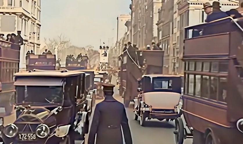 Η εικόνα είναι ιδιαίτερα ενδιαφέρουσα, καθώς πέρα από τα αυτοκίνητα, στους δρόμους της δεκαετίας του ’20 εξακολουθούν να κυκλοφορούν άλογα και άμαξες.