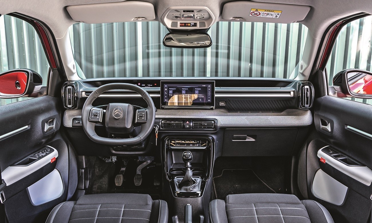 Στο C3 κάθεσαι ψηλά, γύρω σου κυριαρχεί ένας αρμονικός συνδυασμός που αποδεικνύεται ευχάριστος στο μάτι, αλλά συνάμα και λειτουργικός. Ο διάκοσμος δείχνει αρκετά τακτοποιημένος, η οθόνη αφής 10,25” (απουσιάζει από τη βασική You!) υιοθετεί απλά γραφικά και εύχρηστα shortcuts, ενώ τη θέση του πίνακα οργάνων έχει πάρει μια στενόμακρη απεικόνιση (βασικά ένα head-up display που προβάλλεται σε ειδική οθόνη) με πλούσια πληροφόρηση, αλλά με κάπως δυσδιάκριτα γραφικά. Το έξυπνο φινίρισμα και οι όμορφες επενδύσεις δημιουργούν μια ευχάριστη εικόνα με νεανική αύρα.