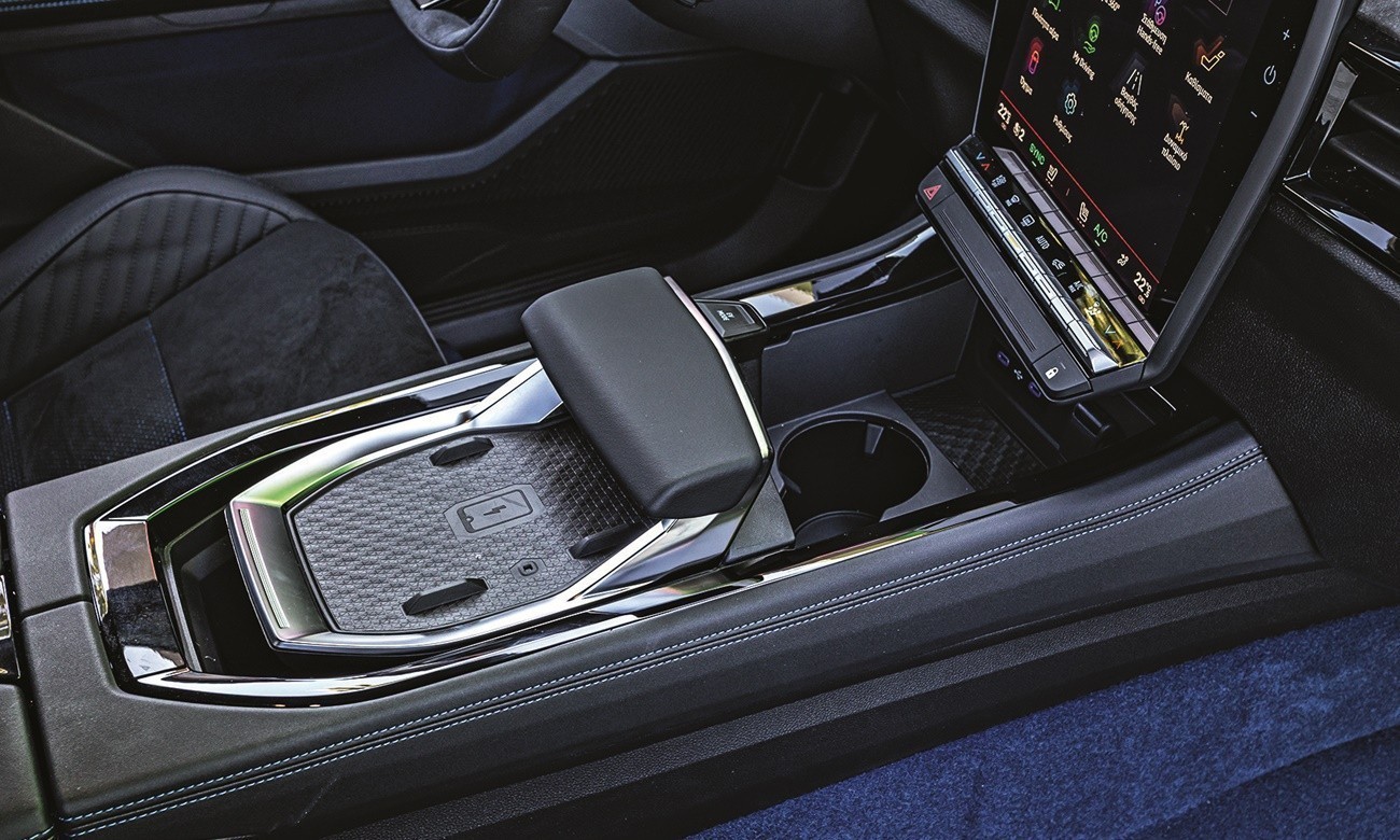 Οι χώροι είναι γενναιόδωροι. Οι πίσω επιβάτες θα καθίσουν άνετα, ανεξαρτήτως σωματότυπου, και δεν θα αντιμετωπίσουν πρόβλημα ούτε με τα κεφάλια τους, παρά την κουπέ σχεδίαση. Υπάρχουν επαρκείς θήκες για μικροπράγματα, ενώ το συρόμενο εμπρός υποβραχιόνιο που θυμίζει το throttle lever πολεμικού αεροσκάφους (τι σόι Rafale θα ήταν αν δεν είχε…) κρύβει τις ποτηροθήκες, ενσωματώνει το μπουτόν από το οποίο επιλέγεις τι είδους λειτουργία θέλεις (υβριδική, αμιγώς ηλεκτρική κ.λπ.), αλλά κυρίως είναι πολύ βολικό για να ακουμπάς ενίοτε το δεξί σου χέρι σε μεγάλες αποστάσεις. Εξίσου μεγάλο είναι και το πορτ-μπαγκάζ που φτάνει σε χωρητικότητα τα 627 lt.