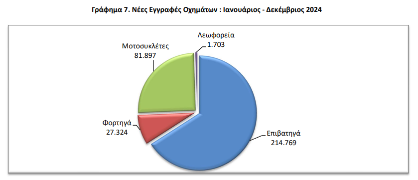 Την περίοδο Ιανουαρίου – Δεκεμβρίου 2024 κυκλοφόρησαν για πρώτη φορά 243.796 αυτοκίνητα (καινούργια ή μεταχειρισμένα εξωτερικού) έναντι 238.117 που κυκλοφόρησαν την αντίστοιχη περίοδο του έτους 2023, παρουσιάζοντας αύξηση 2,4%. Αύξηση 16,1% είχε παρουσιάσει το δωδεκάμηνο Ιανουαρίου – Δεκεμβρίου του 2023 σε σχέση με το αντίστοιχο του 2022. Τα καινούργια αυτοκίνητα που κυκλοφόρησαν την περίοδο Ιανουαρίου – Δεκεμβρίου 2024 ανέρχονται σε 148.276 έναντι 145.667 που κυκλοφόρησαν την αντίστοιχη περίοδο του έτους 2023, παρουσιάζοντας αύξηση 1,8%.