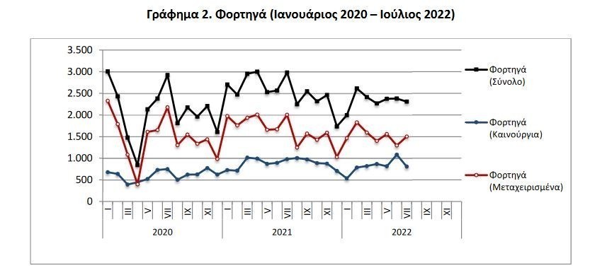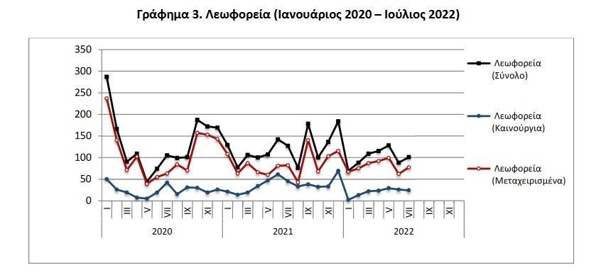 Τα καινούργια αυτοκίνητα που κυκλοφόρησαν την περίοδο Ιανουαρίου – Ιουλίου 2022 ανέρχονται σε 71.541 έναντι 75.118 που κυκλοφόρησαν την αντίστοιχη περίοδο του έτους 2021, παρουσιάζοντας μείωση 4,8%.