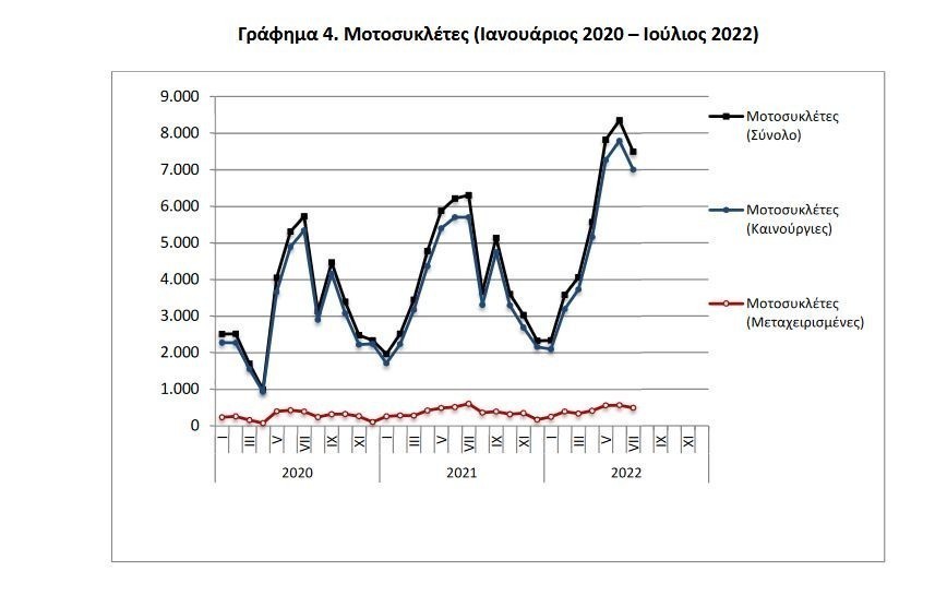 Η κυκλοφορία νέων μοτοσυκλετών άνω των 50 cc (καινούργιων και μεταχειρισμένων εξωτερικού) κατά την περίοδο Ιανουαρίου – Ιουλίου 2022, ανήλθε σε 39.177 έναντι 31.077 που κυκλοφόρησαν την αντίστοιχη περίοδο του έτους 2021, παρουσιάζοντας αύξηση 26,1%. Αύξηση 36,4% είχε παρουσιάσει το επτάμηνο Ιανουαρίου – Ιουλίου του 2021 σε σχέση με το αντίστοιχο του 2020.