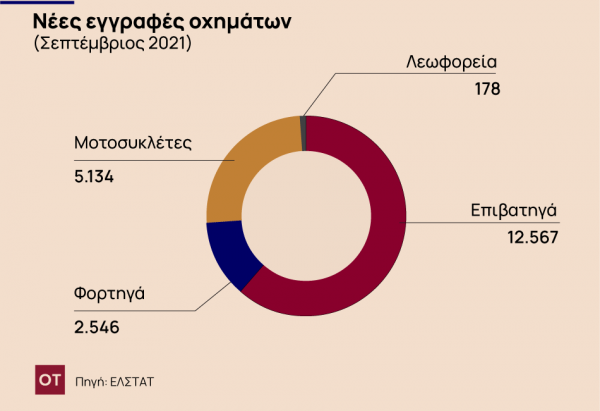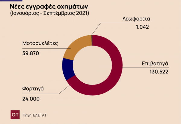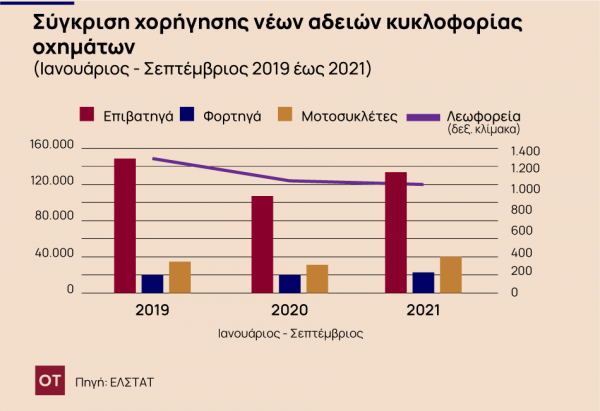 Την περίοδο Ιανουαρίου – Σεπτεμβρίου 2021 κυκλοφόρησαν για πρώτη φορά 155.564 αυτοκίνητα (καινούρια ή μεταχειρισμένα εξωτερικού) έναντι 126.413 που κυκλοφόρησαν την αντίστοιχη περίοδο του έτους 2020,