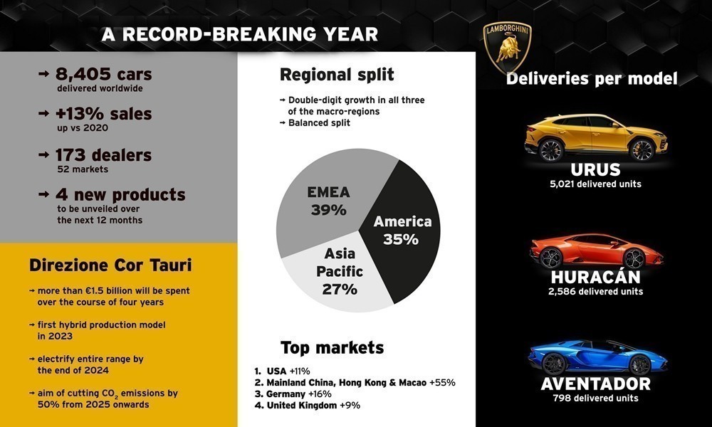 Το 2021 η Lamborghini σημείωσε αύξηση ποσοστιαίου ύψους 13 μονάδων σε σχέση με τις αντίστοιχες του 2020.